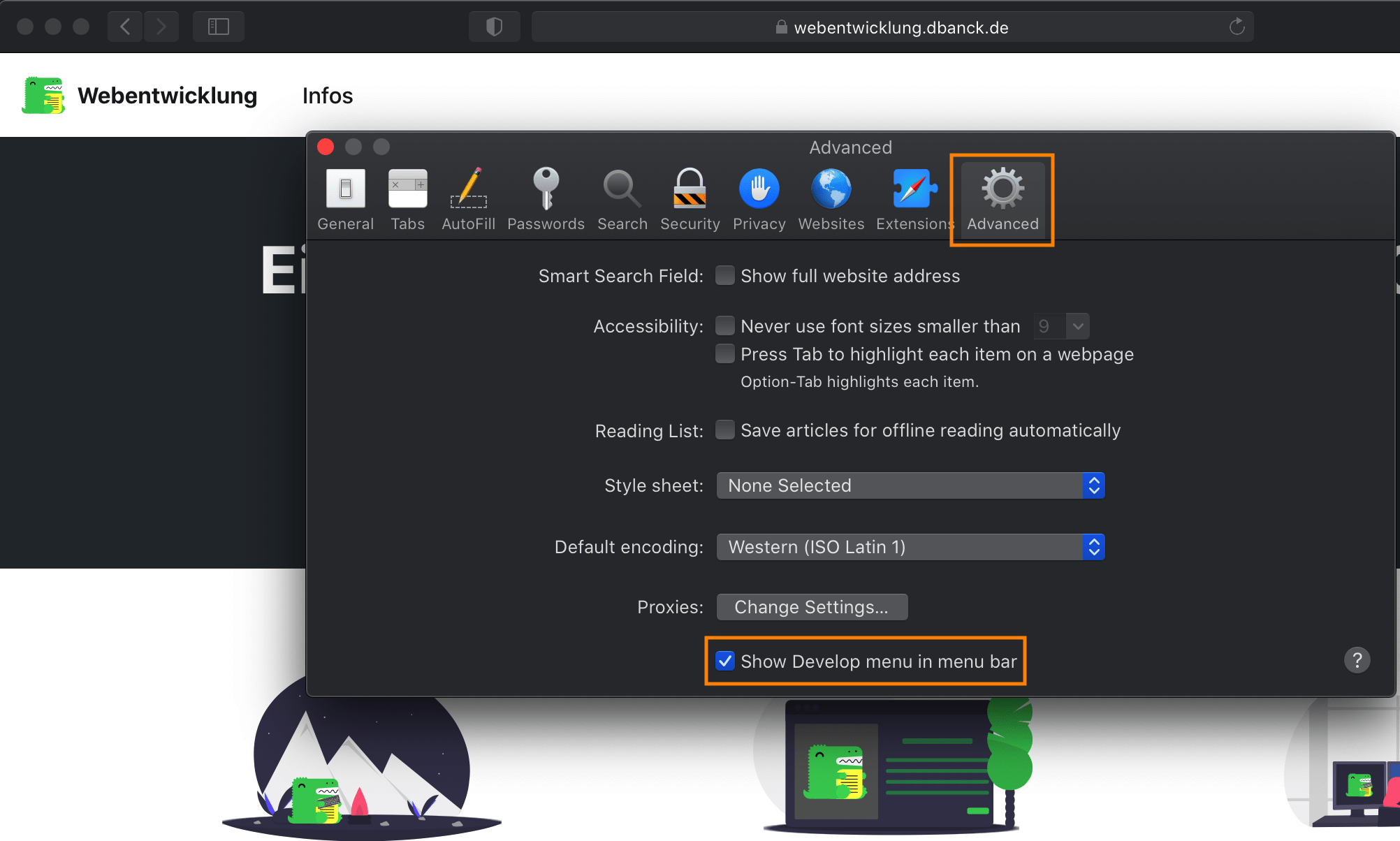 Im Safari müssen die Entwicklertools zuerst in den Einstellungen eingeschaltet werden:
